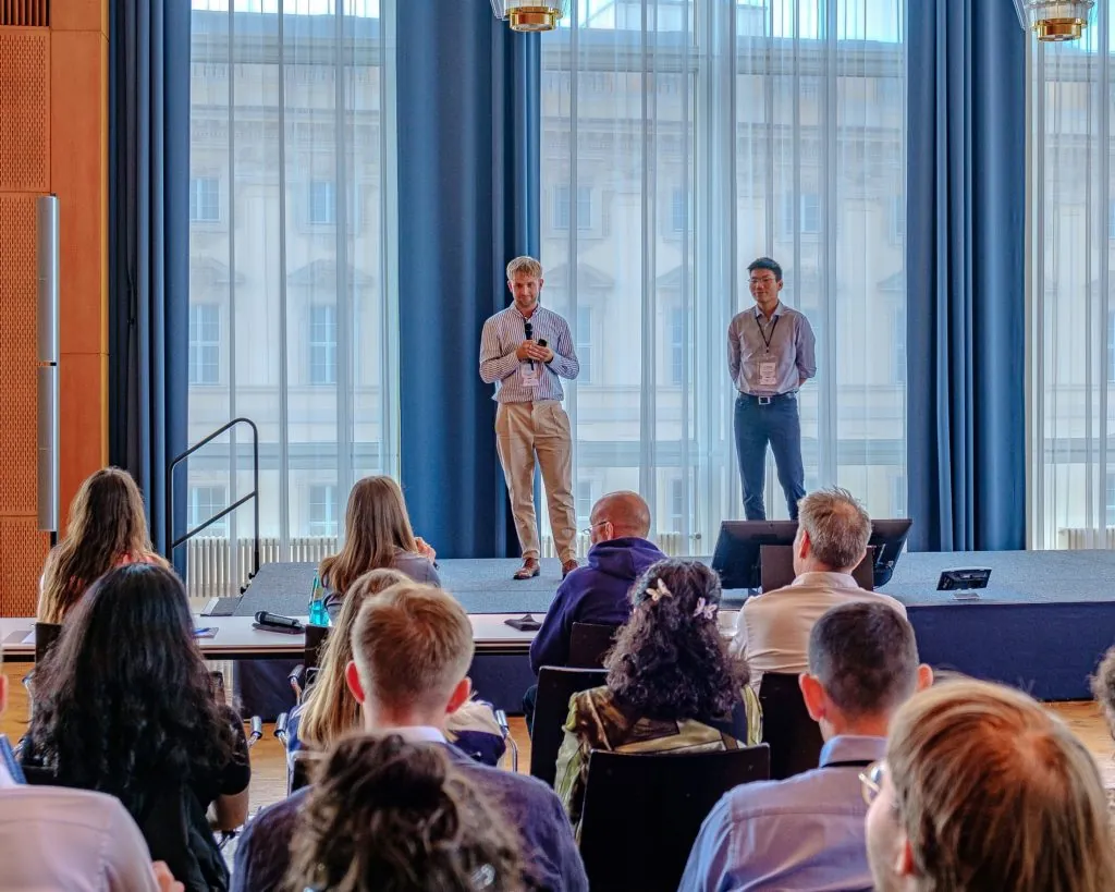 Arthur Fordham of AcouBatt pitches their “battery listening” startup at the INNOVA Europe 2025 Grand Finale at ESMT Berlin, as teammate Chris Xu (at right) looks on. The duo won the Rising Stars category and €20,000 for their technology that uses acoustic sensors and machine learning to hear what batteries are saying to help manufacturers cut waste and boost performance. (Courtesy photo)